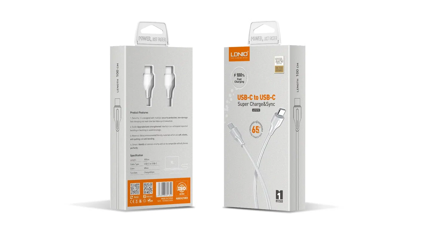 كابل LDNIO USB-C إلى USB-C بقدرة شحن فائق 65 واط – طول 1 متر (LC121C)