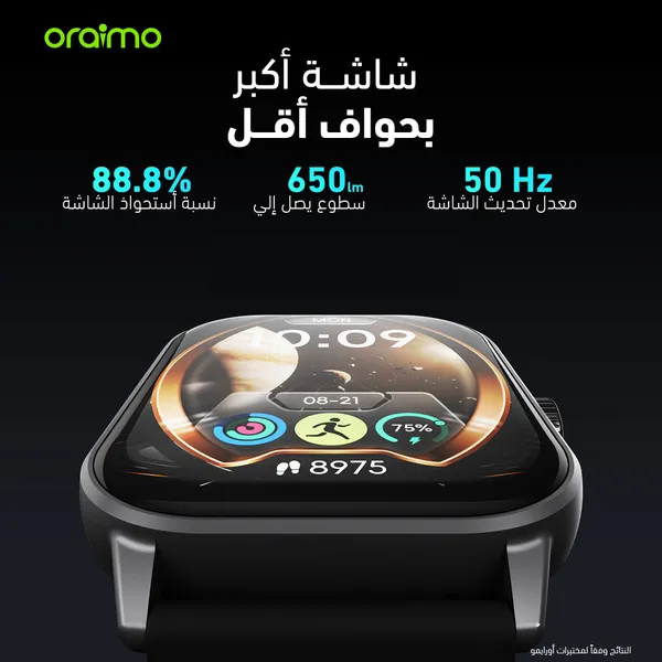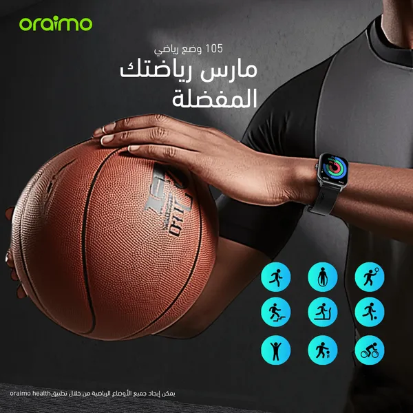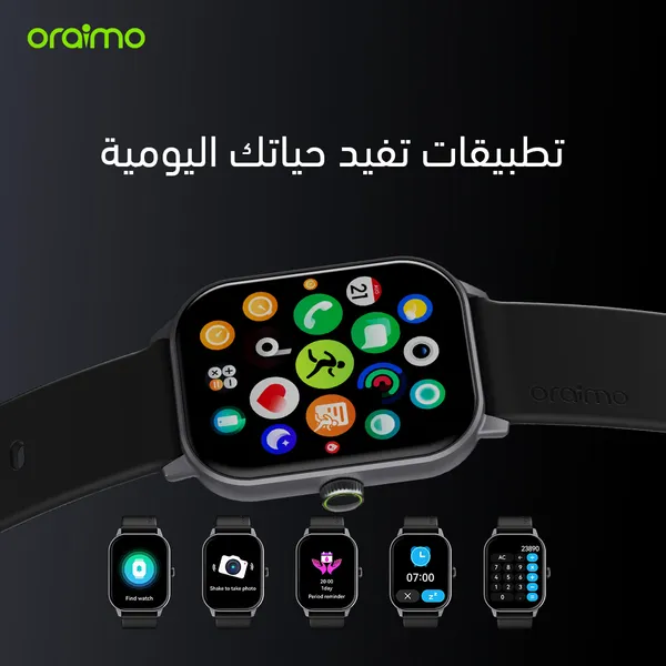 ساعة Oraimo الذكية 6N OSW-8000N - شاشة كبيرة 1.83 بوصة، مكالمات بلوتوث، مراقبة معدل ضربات القلب وSpO2، أوضاع رياضية متعددة، عمر بطارية طويل