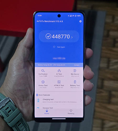 الشاشة تأتي مسطحة بشكل الثقب في منتصف الشاشة من نوع AMOLED وتأتي بمساحة 6.77 إنش بدقة FHD+ بجودة الـ 1080×2392 بكسل بمعدل كثافة بكسلات 388 بكسل لكل إنش تدعم معدل تحديث 120Hz مع سطوع عالي يصل الي 1800 شمعة ( فعلي 1300 شمعة ) .